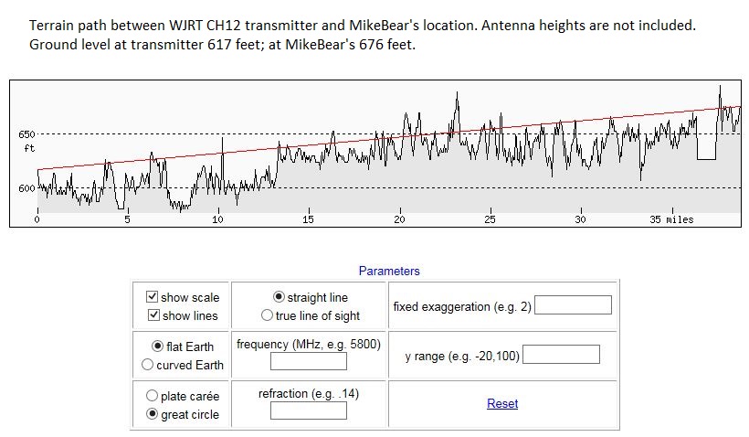 The average peaks on your side are at 680 feet; the tall one is only 15 feet more than that average. It would be difficult to see that difference when standing there, but that peak does project into the signal path, and it can't be ignored. That extra 15 feet probably isn't any more than the height of the trees. Also, the resolution of the measurement data probably isn't that precise. Sorry, didn't mean to mislead you, I was just curious to see what a close-up profile would show. |