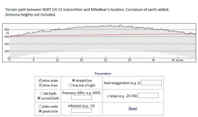 In order to better understand your situation, I looked at some aerial photos of your area and the channel 12 signal has to cross your neighbor's roof and also two other houses. I also did some terrain profiles for the signal path from the CH 12 transmitter to your location. The transmitter is at the left end and your location is at the right.