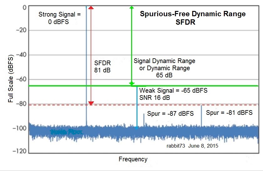 There are three types of preamp or tuner overload, in order of increasing signal strength: 1. The strong signals almost cause enough intermodulation distortion (IMD) to interfere with the reception of weak desired signals, but the spurious signals are at or below the noise floor of the weak signals. This is the point that holl_ands uses in his preamp charts to obtain max SFDR (Spurious Free Dynamic Range). No damage will happen. As the strongest signals continue to increase in strength, more of the weaker signals are damaged until you reach: 2. The strong signals cause overload to the preamp or tuner that makes it impossible to receive any signals. No damage will happen. The strongest signals are still there, but they can't be decoded because the IMD products have damaged them so that they contain more errors (high BER....bit error ratio/rate) than can be corrected by the FEC (forward error correction). 3. The signals are so strong that the input transistor is toast. You are not likely to encounter OTA signals that strong, unless you live next door to a high power transmitter and you have your high gain antenna aimed at the transmitter's antenna. As a general rule, tuners can tolerate stronger signals than preamps before overload. The difference in strength is approx. equal to the preamp gain. Intermodulation Distortion The IMD creates new spurious signals within the preamp (or tuner) itself that can interfere with the reception of your weakest desired signals if the spurious signals are stronger than the noise floor of the weakest desired signals. The spurious signals are caused by the interaction between two or more of your strongest signals. IMD is not the only distortion that can be created within the preamp; you can also have distortion caused by signals so strong that the top of the strong signals are clipped, which causes compression of the signals. This can be seen if you increase the input to the preamp by, for example, 10 dB and the output increases by less than 10 dB. Spurious Free Dynamic Range The Spurious Free Dynamic Range needed is the difference in strength between your strongest signal and your weakest desired signal, plus 16 dB for the SNR of the weakest signal, using the dBm Pwr scale on your tvfool report. This difference is expressed in terms of dB, not dBm, because the original units are the same. The difference between the strongest signal and the weakest signal is the Signal Dynamic Range/Dynamic Range, which is 16 db less than the SFDR, because it doesn't include the SNR of the weakest signal. http://forum.tvfool.com/attachment.p...0&d=1442622539 Another way to think of SFDR is from the top of the strongest signal down to the bottom (noise floor) of the weakest desired signal. The top of the spurious signals must be at or below the noise floor of the weak signals if they are not to cause interference. The Signal Dynamic Range is from the top of the strongest signal down to the top of the weakest desired signal. You can also use the NM scale for your calculations, but I prefer to use the Pwr scale because most tuners drop out around -85 dBm. |