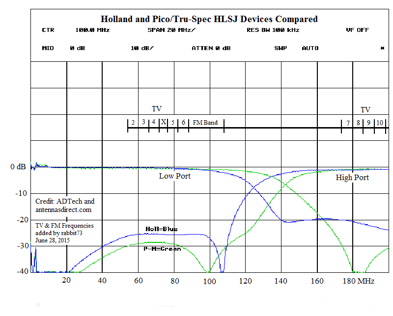 http://www.fmfool.com/modeling/tmp/c...9/Radar-FM.png The Antennas Direct FM filter is just the opposite. It does well at the low 88 MHz end but not as well at the 108 MHz end. http://forum.tvfool.com/attachment.p...0&d=1441159109 The MCM does well at both ends. http://forum.tvfool.com/attachment.p...1&d=1441159163 You can use a HLSJ as an FM filter. It has low loss and attenuates everything below TV CH7 including the FM band. http://forum.tvfool.com/attachment.p...0&d=1447018218 http://forum.tvfool.com/attachment.p...1&d=1447018564 http://forum.tvfool.com/attachment.p...2&d=1447019361 |
