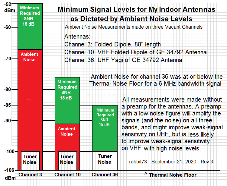 To find the signal strength of Channel 20, I added the attenuator setting to the average tuner dropout point of -85 dBm: -85dBm + 25 dB = -60 dBm To confirm the method, my Sadelco DisplayMax Signal level meter reading was -11.9 dBmV = -60.7 dBm (Since I used a 4-Way splitter, the signal before the splitter was 7 dB stronger. I put a 75 Ohm terminator on the unused port because without it, the outputs weren't equal.) This method works best on UHF. On VHF, where the noise level is higher, dropout will be higher than at -85 dBm. http://forum.tvfool.com/attachment.p...9&d=1600731992 The Thermal Noise Floor for a 6 MHz wide TV signal is about -106 dBm. The Noise Figure for the average tuner is 6 dB: -106 dBm + 6 dB = -100 dBm To that we must add 15 dB to allow for the minimum required SNR for the TV signal: -100 dBm + 15 dB = -85 dBm However, if the ambient noise is stronger than the internal noise of the tuner, the tuner Noise will be buried in the ambient noise. |