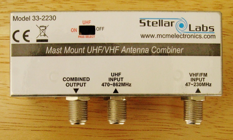 I did some more tests this evening, (all in the last 30 minutes before sunset, for what it's worth). It seems that the 33-2230 UVSJ is greatly attenuating my UHF signals. I was using my Solid Signal HDB91X UHF yagi mounted at 30 feet AGL, with a CM-7778 pre-amp at the mast. In Configuration#1, I sent the HDB91X signal directly to the pre-amp (no UVSJ). In Configuration #2, I combined the HDB91X with the StellarLabs 30-2476 VHF yagi using the UVSJ, and then fed that to the pre-amp. Here are the SNRs as reported by my Sony Bravia (typically need SNR>14 to receive channel):