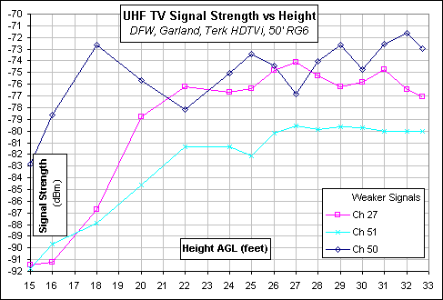 UHF Signal Strength vs Antenna Height (AGL) In the previous post linked above; the signal strength of 27 DTV channels was measured as a small antenna (Terk HDTVi) was raised in height. The signal strength of the individual 27 measured DFW stations varied considerably, from ~-35dBm to about -90 dBm. Due to the wide range of strength, it might not be very instructive to plot all signals on the same graph. The following graph shows three of the weaker signals strength plotted versus antenna height. http://forum.tvfool.com/attachment.p...2&d=1411227205 This graph illustrates what can be seen throughout all the measured signals (strong and weak). That is: 1. Some channels show maxima and minima in signal strength as antenna elevation is changed. 2. The general trend is increasing signal strength with increases in antenna height. Channel 50 shows the most distinct pattern of maxima and minima. This is evidence of signal layering; the constructive and destructive summation of two or more wavefronts. Channel 51, although close in frequency, shows increasing signal strength with small perturbations. The two stations (channels 50 and 51), yield different responses at the receiving antenna, this could be related to differences in path geometry. The transmitting antennas of these two stations are located on different towers and at different tower heights*. Incidentally, both are low power=15kW. *Such transmitter/antenna info can be found at the FCC site, or more conveniently at Rabbitears.info. Channel frequency does matter. The signal wavelength is inversely related to frequency and constructive/destructive combinations are a matter of signal phase (which is wavelength related). Signal strength differences at the receiving antenna are a result of the combination of frequency and path geometry. In a different environment, it is likely that the above trends continue, but a specific frequency (channel) may or may not respond with observable maxima and minima. The response of channel 27 is somewhat typical of the measured channels (total number=27). . |