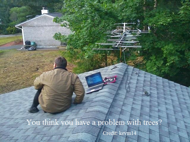 http://forum.tvfool.com/attachment.p...1&d=1416714333 In the photo above Kevin is using a WG 7697P. If you want to read more about his tree problem: http://www.avsforum.com/forum/25-hdt...l#post17280909 http://www.avsforum.com/forum/25-hdt...l#post17283385 http://www.avsforum.com/forum/25-hdt...l#post17297708 It is true that the eave mount gives you the highest point. If the C2V there works well, your problem is solved. If the C2V works well only for the UHF signals, but there is still a problem with 10.1, then you will need to put a UHF/VHF-hi combo antenna, like the Winegard HD7694P, there. If your test there doesn't work because of obstructions, then your only alternatives would be a tripod on the upper roof or a tower in the back yard. Both of them would be difficult to do. If you then reach the point where you have no more options to improve the signals from the NE for the Roamio, then you are left with Plan B. That plan would be to demote the Roamio to a secondary role for recording only. The antenna coax downlead from the AC7 would be connected to a 4-way splitter that would feed the three TV tuners and the Roamio. Quote: