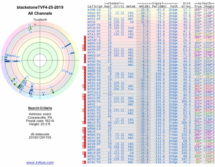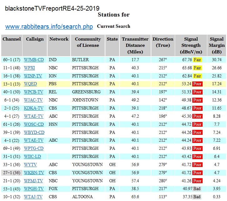 Your current TVFool report doesn't list WPGH because of database errors used to generate the report. https://forum.tvfool.com/attachment....8&d=1556203782 However, a report from rabbitears.info does list WPGH, and its list of channels should be more accurate. WPGH is listed as much weaker than your other channels. https://forum.tvfool.com/attachment....9&d=1556203813 Quote: