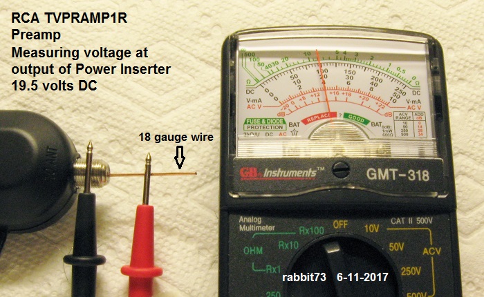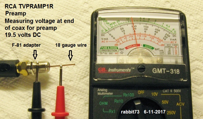 http://forum.tvfool.com/attachment.p...6&d=1512417272 http://forum.tvfool.com/attachment.p...7&d=1512417300 When the preamp is connected, the voltage will drop. It is necessary to use a T-adapter to have access to the center conductor to measure the voltage when the preamp is connected: http://forum.tvfool.com/attachment.p...9&d=1511636090 http://forum.tvfool.com/attachment.p...8&d=1511635684 https://www.amazon.com/gp/product/B0...?ie=UTF8&psc=1 |