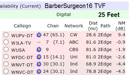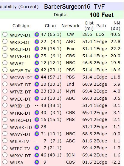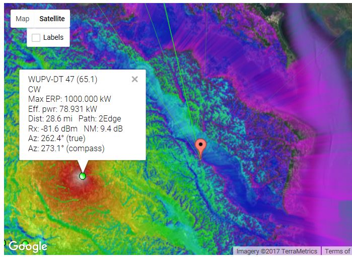 http://forum.tvfool.com/attachment.p...1&d=1504139061 Here is the coverage for WUPV. Note that only 78 kW out of 1000 kW ERP gets to your antenna because of the directional transmitting antenna pattern: http://forum.tvfool.com/attachment.p...1&d=1504139501 http://forum.tvfool.com/attachment.p...1&d=1504140054 |
