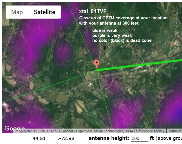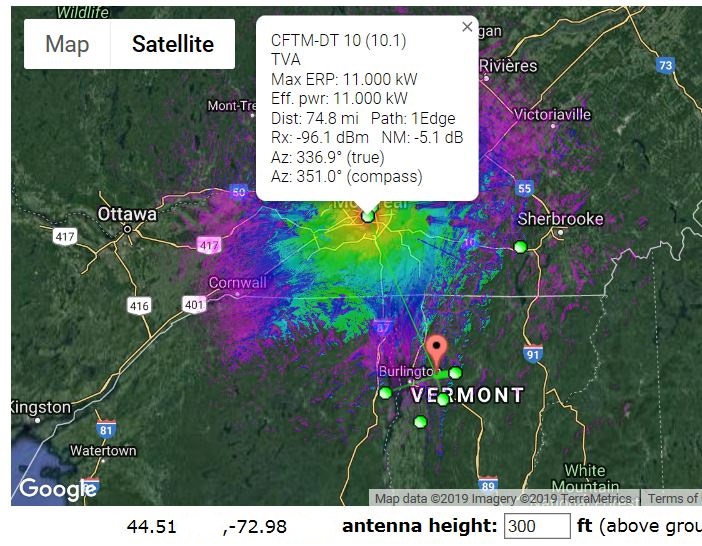 You ask, "... is there a point where the -xxx db scale "ends"?"; (I presume you are referring to the predicted signal power available at your location per the TV Fool or Rabbitears reports) No, but if a signal is weaker than the random noise that is always present, no tuner will be able to lock on and demodulate the signal. Random noise levels are not constant, there is usually lower noise levels in the UHF band than the VHF band. Most appliances, power tools and home electronics emit some noise. If you are looking at the gain specification of an amplifier, the "dB gain" value tells you how much stronger the output signal and noise will be as compared to the input. It's possible to have too much gain. This is more likely to be a problem when there are one or more strong signals present. The CM7777 is known for it's high gain and it's tendency for overloading. It is designed for applications where there are no strong signals present. It's a good amplifier when it's used for what it was designed for (an area with only weak signals). When used improperly you can expect to get less reliable reception due to the distortion of the signals as they're over amplified. The signal levels on your report definitely are too strong for amplifiers like the CM7777. Bottom line, An amplifier might get you a couple of additional PBS stations. I don't expect an amplifier to make any Canadian signals reliable at your location. You would need to mount an antenna on a mountain top to overcome the terrain between you and Montreal. |
