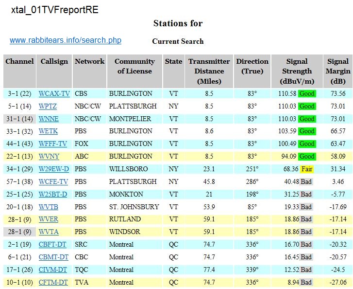 I had a "fancy" home made tuned job till this week ... I don't remember what it was called ... gray-hoverman I think ... reflectors, directors, ... I made in one night just to test ... kept it up for three years, finally started to rot so I dumped it. It got me 18 channels sitting on the porch (second story of our house). I have a cheap Windegard FV-30BB just sitting under the TV inside the house upstairs .... I get 18 channels. I have an RCA ANT751R ... just sitting on the lower floor of the house inside ... 18 channels. And maybe 18 is all we will ever get. With the Gray-hoverman, I did get more with an amp ... sometimes ... don't know if the amp was flaky or the antenna (this was just a test model made of some thick aluminum wire and a wood frame ... but measured fairly accurately). WOW ... I had never tried the "rabbit ears" ... super accurate ... I get the first 6 ... good and fair ... not the "poor" ones .. thought I think I did get one of the poor ones and one of the bad ones before my Radio Shack amp died. Mike PS..... there is no antennas mounted yet ... been building the house for 5 years ... almost done ... just got a new tv, thus time for a more permanent antenna ... I am always surprised that the RV antenna (20 year old amplified directional wineguard) seems to work as well as or better than anything else |