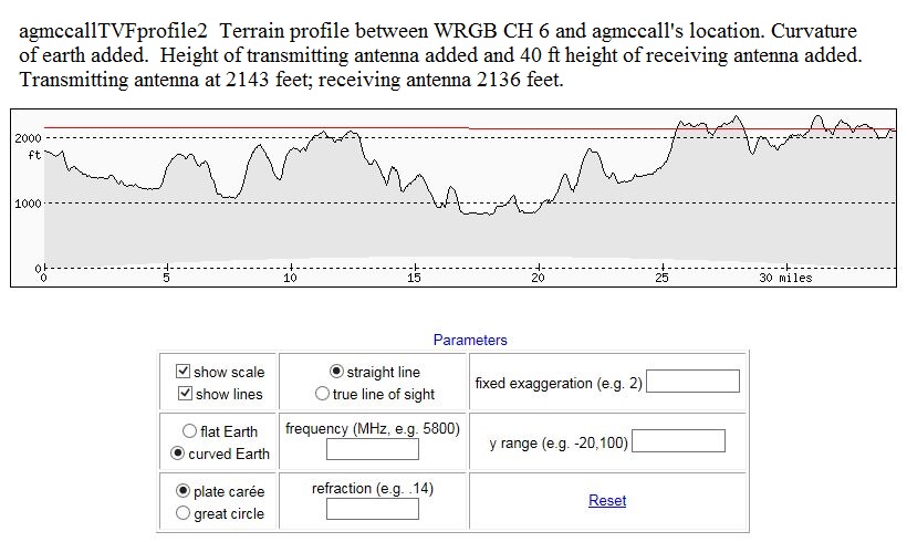 Your weakest signal (the transmitter is at the left end; your location at the right): http://forum.tvfool.com/attachment.p...8&d=1442186387 http://forum.tvfool.com/attachment.p...9&d=1442186404 Your strongest signal: http://forum.tvfool.com/attachment.p...0&d=1442186421 http://forum.tvfool.com/attachment.p...2&d=1442187582 VHF signals can make it over the peaks better than UHF signals, by refraction. |