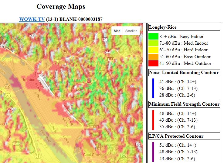 http://www.rabbitears.info/ First Section, Web Listings Type wowk in Find: Call Sign box and click Search which will take you here: http://www.rabbitears.info/market.ph...&callsign=wowk Digital TV Market Listing for WOWK scroll down to WOWK click on Technical Data and Screencaps in yellow band which will expand the yellow band click on RabbitEars TV Query which will take you here: http://www.rabbitears.info/tvq.php?r...ms&facid=23342 RabbitEars TV Query for WOWK WOWK-TV - HUNTINGTON, WV, US - Main Listing scroll down to Area: and click on Longley-Rice Coverage Map which will take you here: http://www.rabbitears.info/contour.p...=2001528&map=Y Coverage Maps WOWK-TV (13-1) BLANK-0000003187 Look for Ashland; it is half way out from the center of the circle toward 9 o'clock zoom in on Ashland Ironton is NNW of Ashland Your location is just SW of where 141 meets 52 You will see more signal color in your area because WOWK is stronger than WCHS but there is a dead zone around S 10th and Adams St near the Holiday Inn http://forum.tvfool.com/attachment.p...6&d=1460052307 Keep in mind that field measurements are made for the contour circles, but the color patches are the result off the Longley-Rice computer simulation which gives an impression of greater accuracy than what actually exists. Your tuner will tell you the truth, especially with 2Edge signals. Quote: