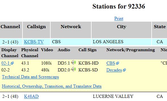 by zip code http://www.rabbitears.info/search.ph...pe=dBm&height= http://forum.tvfool.com/attachment.p...1&d=1473618890 click on callsign to see subchannels http://forum.tvfool.com/attachment.p...1&d=1473619272 The display channel is the same as the virtual channel; the physical channel is the same as the real channel. You can do it here: http://www.rabbitears.info/search.php If you enter just the zip code, the distance and direction will be off. If you add your street address, it will be more accurate. If you also check Strength Search (optional), it will generate a report similar to a tvfool report. I will not give a link to that result because it will show your street address. http://forum.tvfool.com/attachment.p...5&d=1473620632 Why do you need to know the actual frequency of the channel? The only time I need it is to design an antenna for a certain channel, to calculate the specs for an interference filter, or to know if the second harmonic of an FM transmitter falls on a VHF-High channel. |