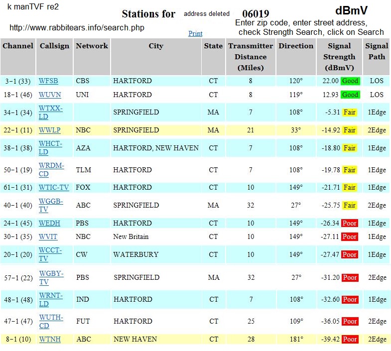 I see you are going to give ABC another try. Jake is right; you need to try some of the ideas suggested in your previous thread to improve your reception of ABC. I favor something like Jake's idea No. 2 for WTNH, because if you try for WGGB, it will be difficult to combine two UHF antennas without a custom combiner. Both are very weak, but WTNH is on VHF-High channel 10 so it will be easy to combine the two antennas with a UVSJ UHF/VHF combiner. You shouldn't need a preamp for your first 5 UHF channels, it would probably be overloaded by WFSB. The MCM 30-2475 or the higher gain 30-2476 would be a good choice for WTNH. They are inexpensive, have poor assembly instructions, but usually perform well. http://www.mcmelectronics.com/produc...-2475-/30-2475 http://www.mcmelectronics.com/produc...-2476-/30-2476 The antenna should be aimed at 195 degrees magnetic with a compass (182 degrees true). UVSJ http://www.solidsignal.com/pview.asp?p=uvsj http://mjsales.net/products/tru-spec...ant=1198505857 You have some strong local FM signals that might interfere with the reception of ABC and will need an FM filter. You could use the Antennas Direct FM filter, but I think a HLSJ, high and common ports, would give more rejection of WCCC-FM on 106.9 MHz. http://www.fmfool.com/modeling/tmp/5...6/Radar-FM.png https://www.antennasdirect.com/store...on_filter.html the HLSJ blocks all signals below channel 7, including the FM band http://www.solidsignal.com/pview.asp?p=zhlsj Code: