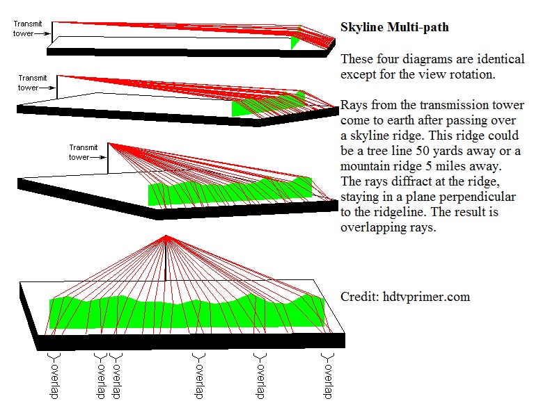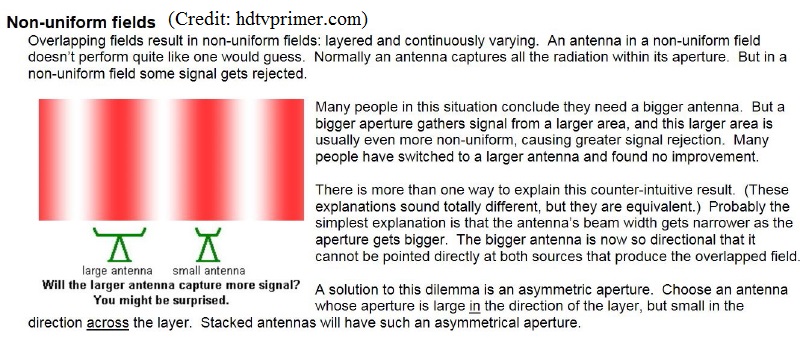 I did a terrain profile that shows how the curvature of the earth blocks the direct signal and causes it to graze the surface and be subjected to ground clutter interference. http://forum.tvfool.com/attachment.p...1&d=1475689113 The ground clutter interference will cause scattering of the signal so that it presents a non-uniform wave front to the antenna. This non-uniform field makes the location of the antenna very critical, because there will be hot spots and cold spots. http://forum.tvfool.com/attachment.p...5&d=1466633825 http://forum.tvfool.com/attachment.p...6&d=1446858514 http://forum.tvfool.com/attachment.p...1&d=1475692853 It is also possible to have a non-uniform field in the vertical direction. Moving a UHF antenna a little as 6 inches up or down can make a difference. That would be easier for you to do than moving it in a horizontal direction. I wonder how the DB4e would do now? http://www.hdtvprimer.com/antennas/siting.html |