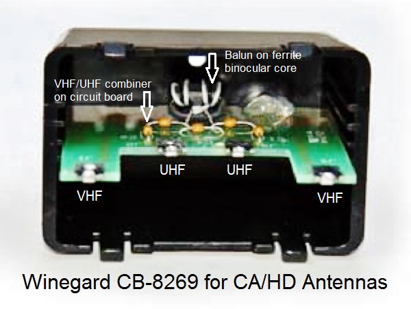 http://forum.tvfool.com/attachment.p...1&d=1483889050 in RCA ANT751: http://forum.tvfool.com/attachment.p...1&d=1483891000 The CB-8269 does two things, it combines the VHF and UHF sections so that they don't interfere with each other, and its internal balun converts the antenna to 75 ohms for the coax downlead. You could do a custom modification as done in the second video above. Connect a balun to the VHF section and another balun to the UHF section and combine them with a UVSJ. http://forum.tvfool.com/attachment.p...6&d=1483489795 http://forum.tvfool.com/attachment.p...1&d=1483891748 http://forum.tvfool.com/attachment.p...1&d=1483892367 http://www.channelmaster.com/TV_Ante...p/cm-94444.htm http://www.solidsignal.com/pview.asp?p=uvsj |