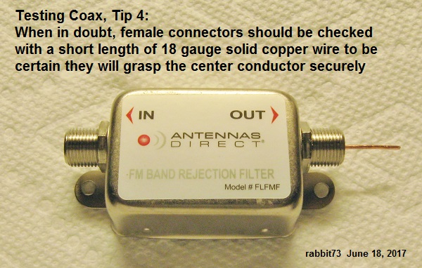 If you don't have access to both ends near the meter when checking for continuity, short the far end and check between the center conductor and the shield and the end by the meter. It should be a few ohms. The test current makes a round trip out the center conductor, through the short at the far end, and then back to the meter on the shield. To check for shorts in the coax, neither end should be connected. Make a resistance check between the center conductor and the shield at either end. It should be an open circuit, with no continuity. Do the resistance measurements first. If the coax is OK, then do the voltage measurements. When you make voltage measurements, start at the power inserter without the coax to the preamp connected. Measure the voltage at the connector that goes to the preamp between the center and the shield threads being careful not to short the voltage. I usually stick a short length of 18 gauge solid copper wire in the connector for the voltmeter probe. Then connect to coax to the power inserter and check the voltage at the end of the coax that connects to the preamp. Again, be careful not to short the shield to the center conductor. I usually insert an F-81 adapter on the end of the coax and then insert a short length of 18 gauge solid copper wire as with the power iinserter. |