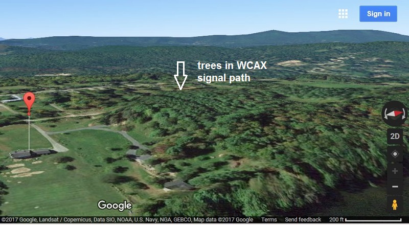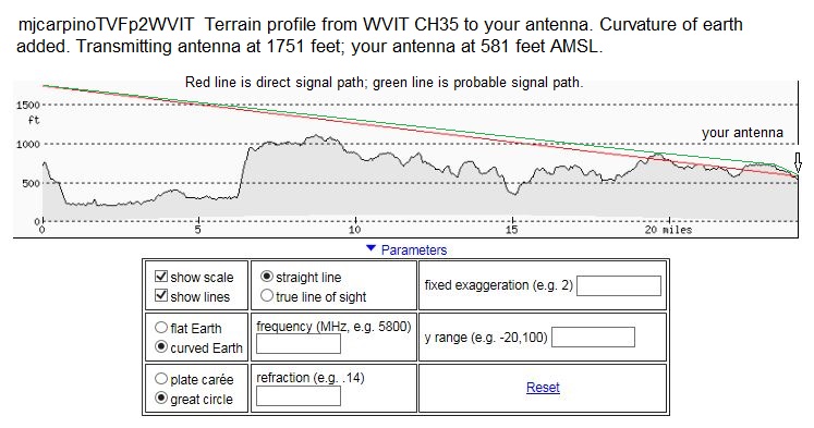 http://www.heywhatsthat.com/profiler.html To use the software, I had to enter your coordinates and the coordinates of the transmitter. Since I don't know the coordinates of your antenna, I had to make an estimate derived from your tvfool report. So, there could be some errors from that, along with some inherent in the software. It takes a while to learn how to use it, because there isn't much in the way of directions. jrgagne99 has some doubts about the accuracy of the software. In his case, it shows a hill in the signal path that he says isn't there. I think what happened in his case, there is a tall stand of trees in the signal path that was read as an increase in elevation. The elevation readings were probably done by aerial survey, which might include the height of the trees. Years ago, elevation was measured on the ground from benchmarks. In the final analysis, it's just as damaging to the signal as a hill. I think this is what he remembers: http://forum.tvfool.com/attachment.p...1&d=1474416567 http://forum.tvfool.com/attachment.p...2&d=1474417001 This is his thread: http://forum.tvfool.com/showthread.php?t=16101 This view supports JR's contention that there isn't much of a nearby hill in the WCAX signal path, but there are certainly a lot of trees, unless they have been clear cut. http://forum.tvfool.com/attachment.p...1&d=1499380880 |