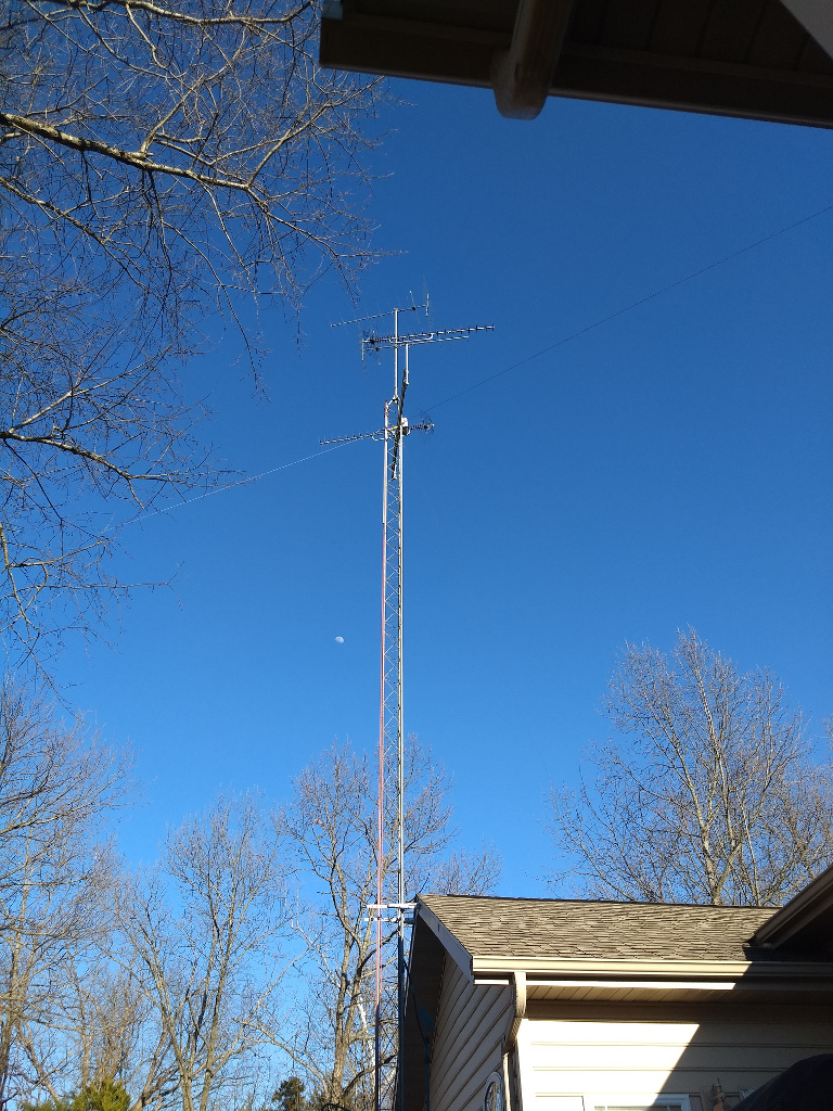 Thanks! It's a 50' Rohn 25G with a 10' mast. The box is a demarcation box for coax connections. It made weather proofing the connections easier. It's big enough to house a preamp if I need to when the trees leave. I had to play with different length coax cable connections to deal with multipath interference.