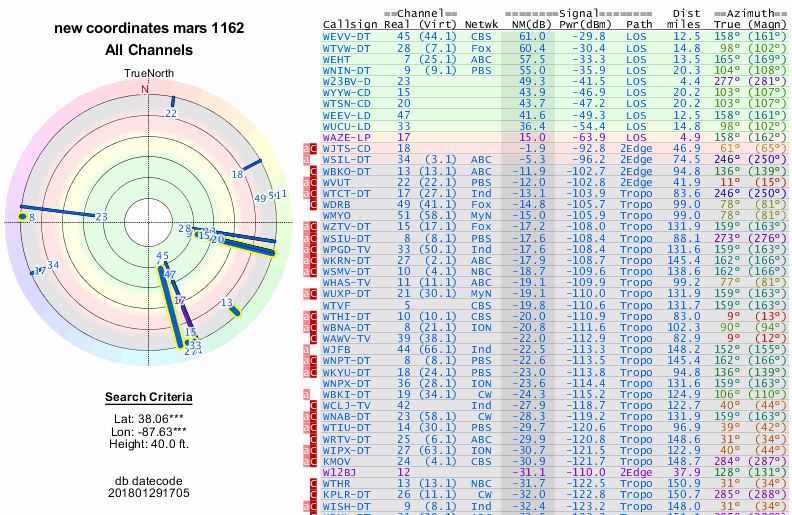 Ok here is my TV Fool Report http://www.tvfool.com/?option=com_wr...9038b9ec20c134 Rabbit73 & ADTech Antenna worked as should as far as receiving best dead in front with the amplifier on antenna not powered. Or shall we say bypassed. I did lose 2 stations without amp on. They are WSIU Carbondale IL and WTUV Vincennes IN. WSIU is not on my plot map. Virtual 16 and actual 19 I think. You guys were right I think about the variable gain on amp causing the signal to seem skewed on antenna.Thanks a bunch for the info and help.