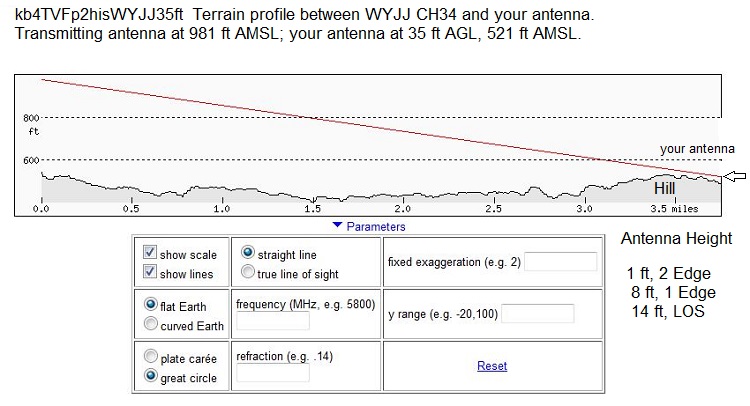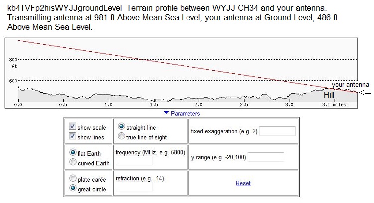 https://forum.tvfool.com/attachment....9&d=1555013747 Here is the terrain profile with your antenna at 35 feet above ground level. The signal clears the hill, but it doesn't clear the trees. The software uses the ground elevations but doesn't add the trees. https://forum.tvfool.com/attachment....0&d=1555014063 |