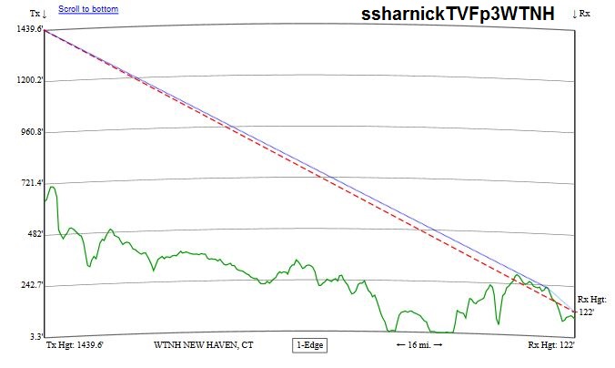 From the area of Cutspring Rd and Chapel St I show the following at 50' AGL. Callsign Chan Network Dist (mi) Path NM (dB) WZME 42 (43.1) 8.9 LOS 64.5 WFTY-DT 23 Tel 25.4 LOS 54.9 WTNH-DT 10 (8.1) ABC 16.0 2Edge 40.3 WLNY-DT 47 (55.1) Ind 25.7 LOS 35.1 WCBS-TV 22 CBS 25.7 LOS 34.3 WCTX-DT 39 (59.1) MyN 16.0 2Edge 24.9 WEDY 41 13.3 2Edge 23.0 WTXX-LD -- 34 16.8 2Edge 13.9 W26CE 25 (26.1) 32.1 LOS 12.6 WABC-TV 7 ABC 58.5 2Edge 11.9 WJLP 3 (33.1) 55.6 2Edge 11.0 WVIT-DT 35 (30.1) NBC 35.7 2Edge 5.8 WPIX 11 (11.1) CW 58.6 2Edge 2.0 WXTV-DT 40 (41.1) Uni 55.9 2Edge 0.4 WTIC-TV 34 Fox 35.9 2Edge -0.5 WCBS-DT 33 (2.1) CBS 55.9 2Edge -0.5 WFSB -- 36 CBS 41.0 2Edge -0.8 There is a translator for WCBS currently on Rf 22 that you should have no issue receiving. For starters, I would rotate your current antenna toward the WCBS Long Island translator and see what you get. If you get a decent signal, then you need to understand you will need two antennas or a rotor to get all your stations. If you do not get a decent signal, then I would try raising the antenna above the tree line or about 50' AGL. If that works, then you know you'll need to raise the antenna and will still need either two antennas or a rotor. You will need to experiment with the height and location of the antenna. Try avoid any nearby trees or obstacles which will reduce your chances for success. When aiming, remember that dead on to the transmitter doesn't always give the best reception. Let us know how things work out. |