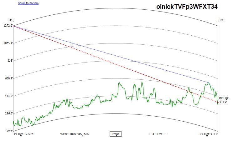 Right now WFXT 34 is probably using their CBS Tower transmitter: https://forum.tvfool.com/attachment....7&d=1567552154 When they switch to their regular Cabot St transmitter, your chances should improve: https://forum.tvfool.com/attachment....8&d=1567552202 But, you will still have your old problems like the WFXT coverage is spotty in your area. Red is the weakest listed signal strength; no color is weaker: https://forum.tvfool.com/attachment....9&d=1567552596 and there is a hill in the signal path just before your location: https://forum.tvfool.com/attachment....0&d=1567552928 https://forum.tvfool.com/attachment....1&d=1567552951 https://forum.tvfool.com/attachment....2&d=1567552996 And the TREES surrounding your house that block TV signals. |