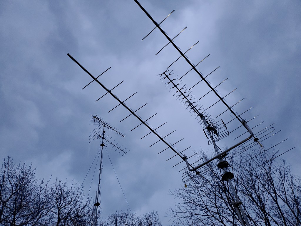 I definitely wanted to get it done though because I think we're going to have rain the next couple days. I was only about halfway done when the rain started to fall. I couldn't haul both of the antennas up by myself so I took one of them off the crossbar. Next time I'll take both of them off the crossbar. I wish I could have measured the spacing between the booms a little bit better but the rain began to fall quite a bit harder. They're kind of pigeon-toed right now judging by looking at the pictures. So, I ended up plugging in the two VHF antenna array into the VHF half of my RCA PREAMPR1... I used the CC 7870 as the combiner. I'm going to have to make two new cables as they are stretched to their limit. I don't want to break the plastic baluns. I took the ladder down and right after it stopped raining for a few seconds so I put the single 30-2476 back up on the mast in the lower position. The Spectrum analyzer pattern looks similar to when I had the pair down low like that so maybe it's roof reflections or ground reflections. I don't think the signal of the two antennas is any stronger than the single antenna even when mounted up high. Still, there's room for improvement I feel. http://forum.tvfool.com/attachment.p...1&d=1586654511 |