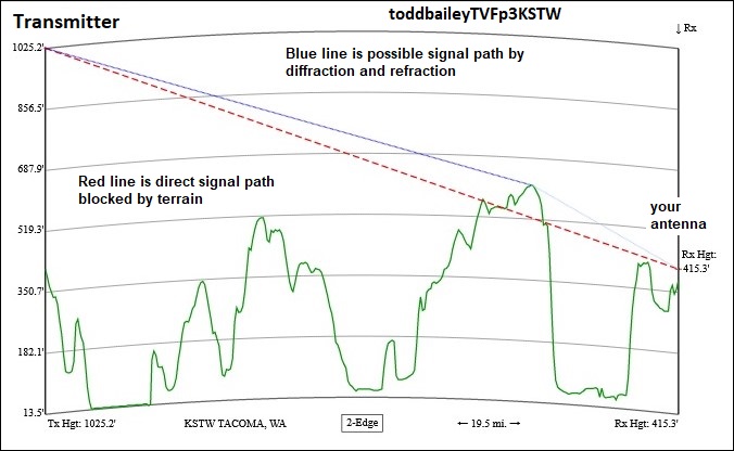 https://forum.tvfool.com/attachment....1&d=1616277928 https://forum.tvfool.com/attachment....2&d=1616277969 9-1 (9) KCTS and 11-1 (11) KSTW are both listed at about the same strength; but you receive KCTS better. KCTS is licensed in Seattle and KSTW licensed in Tacoma, but the towers are close together in Seattle on Capitol Hill. https://forum.tvfool.com/attachment....3&d=1616283516 The original 4228 was designed primarily for UHF signals, but it has some useful gain on VHF-High (7-13). https://forum.tvfool.com/attachment....4&d=1616283879 KCTS and KSTW have a similar terrain profile; there is a hill in the signal path: https://forum.tvfool.com/attachment....5&d=1616285127 KCTS is running 21.7 kW ERP to an non-directional antenna and KSTW is running 100kW ERP to a very directional antenna that sends much less than 100 kW in your direction. I suspect that the KSTW signal is weaker at your location because of the slightly different signal path, the signal diffraction at the crest of the hill, and the trees surrounding your location. If you want to improve the reception of KSTW, you will need a separate antenna designed for VHF-High like the Stellar Labs 30-2476 or 30-2475. This antenna should also improve the reception of 13-1 (13) KCPQ. Try it without its own preamp first. KFFV is much weaker. If you are not able to receive it with your 4228 antenna aimed at 238 deg true, you could try adding a medium gain preamp at the antenna. The risk is that the much stronger signals from the south might cause overload even though they are in a different direction. A last resort for WFFV would be a third separate antenna for UHF like the Antennas Direct 91XG or Solid Signal HDB91X with a custom bandpass filter for channel 16 and a preamp. |