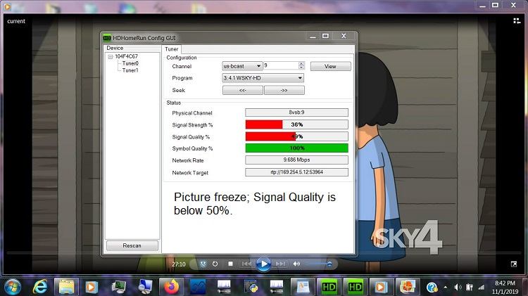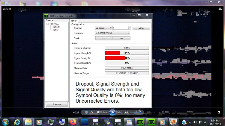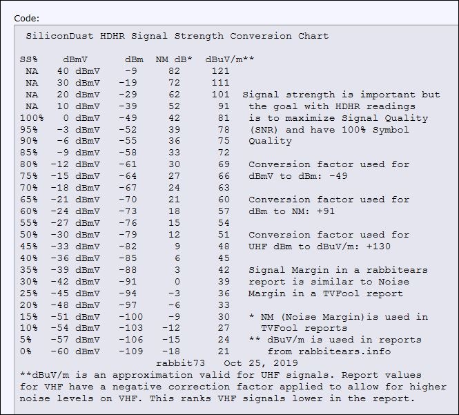When the Signal Strength reaches 100%, that is equivalent to 0 dBmV (-49 dBm). That's about the level antenna installers and cable guys aim for at a wall plate outlet for a TV. However, TV tuners can handle signals much stronger than that without a problem. But if you talk to a SiliconDust tech, he will tell you that you have overload at 100%. It seems that HDHR tuners have a tendency to overload more easily than TV tuners. Signal Quality, which is similar to SNR, must be at least 50%. This is equivalent to about an SNR of 15 dB. Symbol Quality is the inverse of Uncorrected Errors. 100% Symbol Quality is no Uncorrected Errors. You must have 100% Symbol Quality for reliable reception. I did a thread about that topic: SiliconDust Signal Strength Conversion Chart https://forum.tvfool.com/showthread.php?t=16691 https://forum.tvfool.com/attachment....8&d=1620166586 https://forum.tvfool.com/attachment....9&d=1620166673 https://forum.tvfool.com/attachment....0&d=1620166735 https://forum.tvfool.com/attachment....1&d=1620166783 Quote: