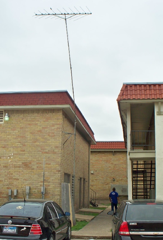 Your idea of swapping antenna positions is a good one. Vertical signal layering can cause a substantial signal strength variation over relatively short distance when antennas are relatively close to ground (in terms of wavelength). About the Winegard balun. It can be installed either way, phase relationship flips with balun reversal, matters not much on single antennas. For stacking, to maintain phase relationship, one must take this into consideration. Antenna rotators can be very useful tools in troubleshooting. -------------------------------- 'Above the top' will be easier explained after a few more photos. -------------------------------- This is a photo of the antennas that replaced the CM-1110. . http://forum.tvfool.com/attachment.p...8&d=1369571323 . The only objective of the VHF antennas was to better receive WKYT (at that time RF channel 13), 74 miles distant, 2-edge diffraction according to TVfool. The configuration: - Two Winegard YA-1713, stacked - Combiner; Winegard CC-7870 - Spacing; 43 inches (was varied +/- 18 inches while watching Signal Meter) - Mast length; 10.5 feet, ~ 7.5 feet above tower. (Made from heavy duty top fence rail (SS-20, ~1 & 3/8 inch outer diameter) - Channel Master antenna rotator moved inside tower for stability. - Final Preamp, Channel Master CM-7777 (original), a WG-3700 was tested - All cables RG-6, custom installed connectors. In 2010, WKYT changed RF channels from VHF 13 to UHF 36, so the YA-1713s were not of much use after that. The configuration stayed in place for approximately a year, until ~mid 2010. . |