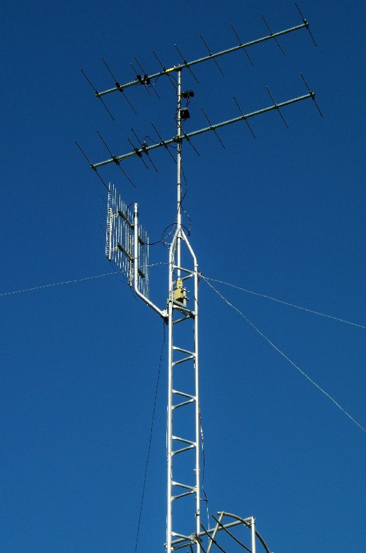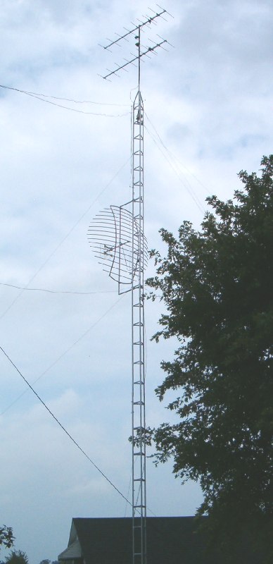 Please, feel free to update on your antenna work. ---------------------- In the meantime, this is an image taken in 2009 of the main tower (lower part shown in Post #1) as it has stood since I personally erected/installed in the early 1970's. The tower and antennas were largely ignored all those years, (meaning almost no maintenance), although they reliably provided TV reception for my parents. The large VHF antenna is a Channel Master Quantum CM-1110. The plastic bucket lodged in the tower was there temporarily for convenience to hold tools and such. The photo was taken just before the CM-1100 was lowered to the ground. Since that time in 2009, there have been several different antennas residing above the tower top, or near the top of the tower. Maybe later can show some of the other antenna arrangements. . http://forum.tvfool.com/attachment.p...7&d=1369333651 |