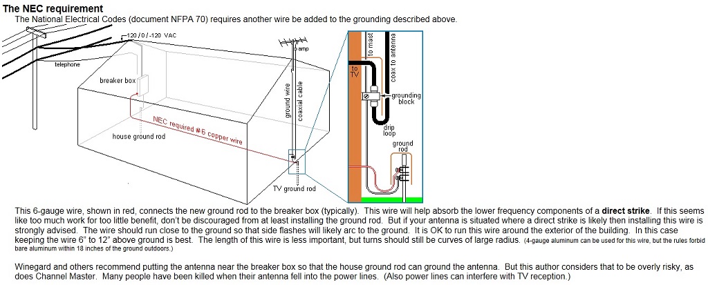 Attachment 565 This is an exact picture of my situation. I cannot mount the antenna on the front of the house due to power lines in the way, so I have to mount it on the back. This creates the problem of there being no direct route for the 10 AWG wire to run to the grounding rod in front. I would have to run it around the house and then I have to worry about bends and frays and other hazards associated with that type of long-run installation. What they have pictured here seems to be the best option for this particular situation. Believe me, I don't want to spend the extra money on a roll of #6 AWG wire, but I don't think there is a safe way to do it otherwise. I also think the best option is to run the #6 AWG wire through the house like they show here. Should I run it through Scheduled 40 conduit? Would that insulate it in case of a strike? And I can connect that #6 AG wire to the ground wire in the box (like is shown in the picture), correct? I don't want to run it inside and then out again. Thanks again for all your advice. I appreciate it. |