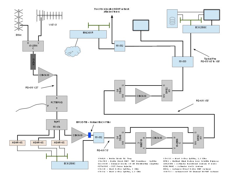 This drawing illustrates the final as-built that I designed and recently finished building for a close family member. The network integrates OTA TV signals from two antennas and Ethernet data on coax (using MoCA modems).