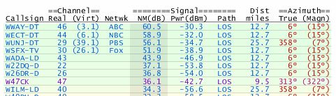 No personal experience with the Lava antenna, but the gain numbers you posted seem absurdly high. They may be reporting the actual antenna gain (sensitivity) plus the amplifier gain. If so, this strikes me as a) intentionally deceptive and b) hiding the real number of interest, which is the antenna gain. An amplifier does not improve the signal; it simply takes what ever signal and noise is there and amplifies both, adding a little more noise of its own. An amplifier can be helpful if the loss of signal due to a long cable run is large compared to the signal quality, or if you have a splitter downstream which will also attenuate the signal. Here are some old posts about the Lava - https://www.google.com/search?q=site...m+lava+antenna - I'm not an antenna engineer (though I a am an engineer), and have no personal experience with the Lava. You should have no trouble receiving the green majors on your plot. If anything, your amplifier is overloading your TV tuner and it's occasionally breaking up. A NM of 60 is more than 1000 times more signal than you ideally need. Just point the antenna north, even indoors unless you live in a cave ... you should have plenty of signal. Can the amp come out of the circuit? It has to come completely out for this test - you can't just unplug it. Connect your antenna's downlead to directly to the TV, if you can. Also, you say you installed; where, on the roof? Pointed how? What are the surroundings? Your antenna has a front and a back, and you'll need to point the front toward the stations you want. |