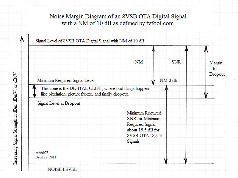 If you look at Larry's tvfool report you will see that NM is dB (power, or more exactly power ratio), not voltage: http://forum.tvfool.com/attachment.p...1&d=1414005979 This is my take on NM: http://forum.tvfool.com/attachment.p...1&d=1414006229 Andy Lee (who created this forum) did an interesting post with diagrams about NM in the long thread that ADTech mentioned above: http://www.avsforum.com/forum/25-hdt...l#post15700679 Click on the second set of diagrams (they were attachments before AVS changed the software) for a larger image. If your cursor has a plus sign, click again for an even larger image. And while I'm at it, there is a lot of confusion about dBmV vs dBm. The dBm scale is used by RF engineers and TV Fool. The dBmV scale is used by antenna installers and cable guys. Both are power, but some people think that dBmV is a voltage scale. It's not; the only thing voltage about it is the 0 dBmV reference level for the scale which is defined in terms of voltage across 75 ohms. http://www.avsforum.com/forum/25-hdt...l#post16837993 |