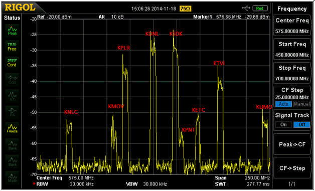 This is an excellent illustration of the damage that can be done by an over-driven amplifier... Looking at the first spectrum analyzer photo, you see the KNLC signal peaking above the noise floor by at least 10 dB... In the second analyzer photo, the added noise and distortion products of the 'fringe amplifier' come close to completely obscuring all of the KNLC signal. KMOV and other signals illustrate the same problem.