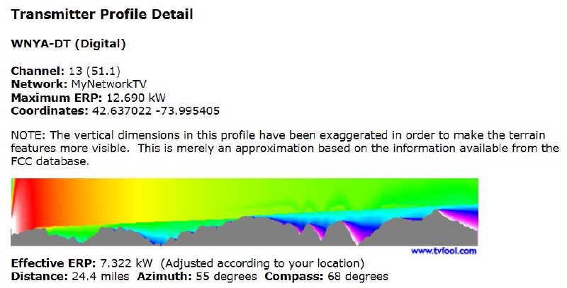 You sound like a tech type, so your friend is lucky to have your help. With signals that miserable he needs it. The terrain between the transmitters and his location is causing interference to the signals, hence the 2Edge designation. Can you run a few more exact address (coordinates for greatest accuracy; maybe using the interactive map feature of tvfool that allows you to move the cursor to the antenna location) reports at different heights to see if it would make a difference? Real channel 13 is the worst; here is its terrain profile. If you click on the callsign in the report, the profile comes up. The transmitter is at the left and his location is at the right: http://forum.tvfool.com/attachment.p...1&d=1429231731 Quote:
