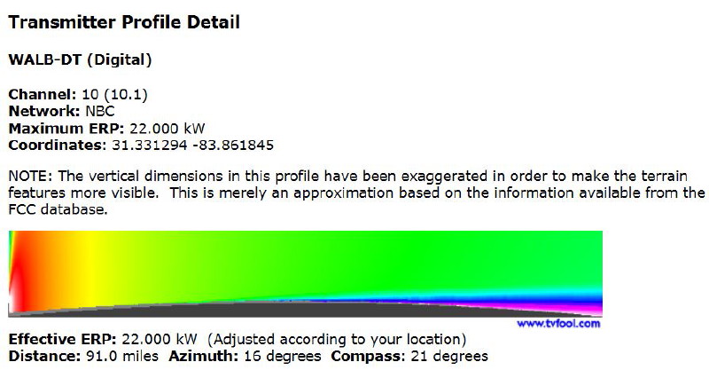 http://www.tvfool.com/?option=com_wr...8e0364dcdd8162 Can someone advise equipment I need to get the highest number of these channels? I am particularly interested in WALB and WFXL in Albany Georgia. I have an el cheapo amplified antenna bought for $20 from ebay on a 20' mast and am constantly having to change directions just to get the Tallahassee stations 40 miles away. Being a native Georgian, I want to hear and see some Georgia sports and news. The terrain in North Florida and South Georgia is mostly flat and I live at the coast. I am leaning toward the Denny's double stacker with some type of amplicication and pointing it about 340 degrees but am really over my head here. |