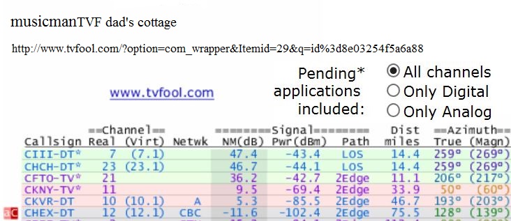 Thanks for the new report for dad's cottage. It's probably more accurate than the generic Gravenhurst report, even though it is only resolved to street level and not an exact address or coordinates. Unfortunately, the signals didn't look as good in the new report, but they got better when I remembered to click on pending.:) The trees are bad news; see attachment 1. http://forum.tvfool.com/attachment.p...1&d=1438990396 Quote: