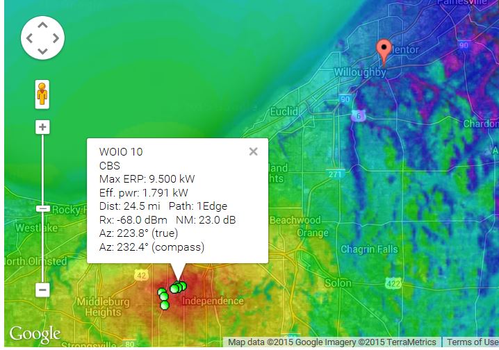 I think you need CBS for the Browns on WOIO real channel 10, virtual channel 19.1. Is that correct? http://www.rabbitears.info/search.ph...pe=dBm&height= Your signals aren't very strong, so it's no surprise that you aren't getting many channels. You would need an outdoor antenna, mounted high, without trees or other buildings in the signal path. I see a lot of trees in your area; see attachment 1. The WOIO signal barely makes it to your area. Notice only about 20 percent of the 9.5 kW signal is sent in your direction. http://forum.tvfool.com/attachment.p...1&d=1439165387 Not impossible, just difficult. |