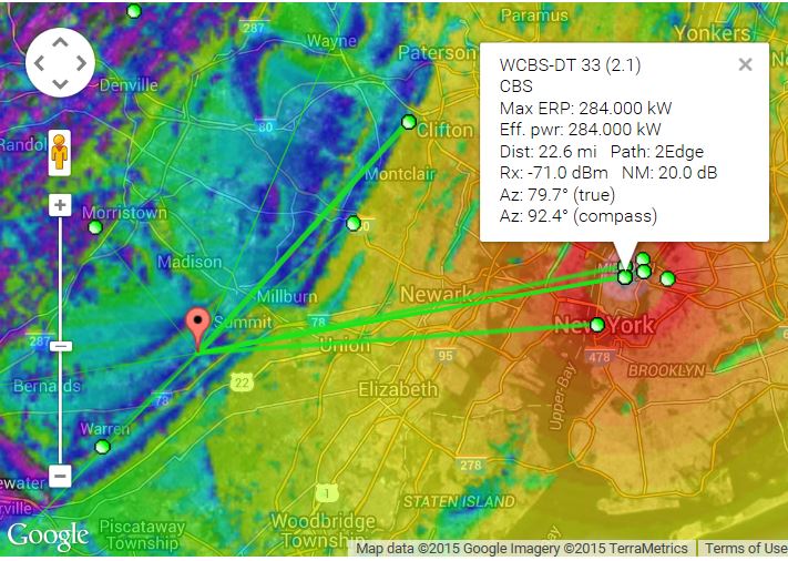 What antenna are you using now, and where is it located? Are you using a preamp? What channels do you need besides CBS? http://www.rabbitears.info/search.ph...pe=dBm&height= The DB8E, with both panels aimed at 92 degrees magnetic would be a good choice. The 91XG yagi would also be a good choice, but these are both UHF antennas for real channels 14-51. If you also need VHF-High real channels 7-13, then you will need a VHF/UHF combo antenna like the Winegard HG7697P or 7698. If you must have WJLP MeTV on real channel 3, then you would need an even bigger antenna that also covers VHF-Low, real channels 2-6. WCBS-DT CBS is a 2Edge signal because of the terrain interference from what I think is the Watchung Mountains. I used to live in NJ and would drive up the mountain for more elevation to operate 2 meter ham radio from my car. If you click on the callsign in your report, you can see the terrain profile. The transmitter is on the left, your location is on the right. See attachment 1. If you look at the coverage map, you can see that the WCBS signal barely makes it to your location. http://forum.tvfool.com/attachment.p...1&d=1439217562 Quote: