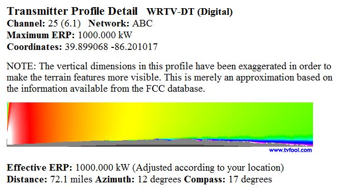 Transmitter Profile Detail WRTV-DT (Digital) Channel: 25 (6.1) Network: ABC Maximum ERP: 1000.000 kW Coordinates: 39.899068 -86.201017 https://www.tvfool.com/modeling/tmp/...RE-WRTV-DT.png NOTE: The vertical dimensions in this profile have been exaggerated in order to make the terrain features more visible. This is merely an approximation based on the information available from the FCC database. WRTV-DT Effective ERP: 1000.000 kW (Adjusted according to your location) Distance: 72.1 miles Azimuth: 12 degrees Compass: 17 degrees |