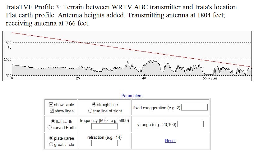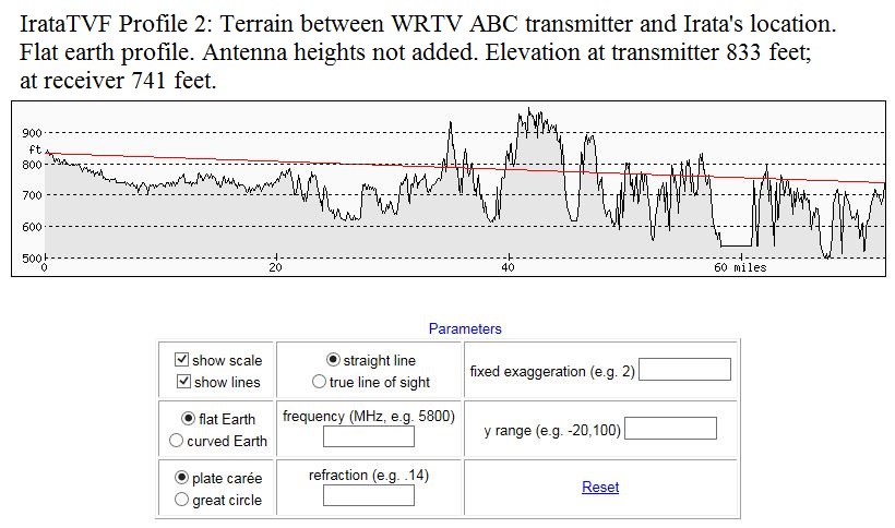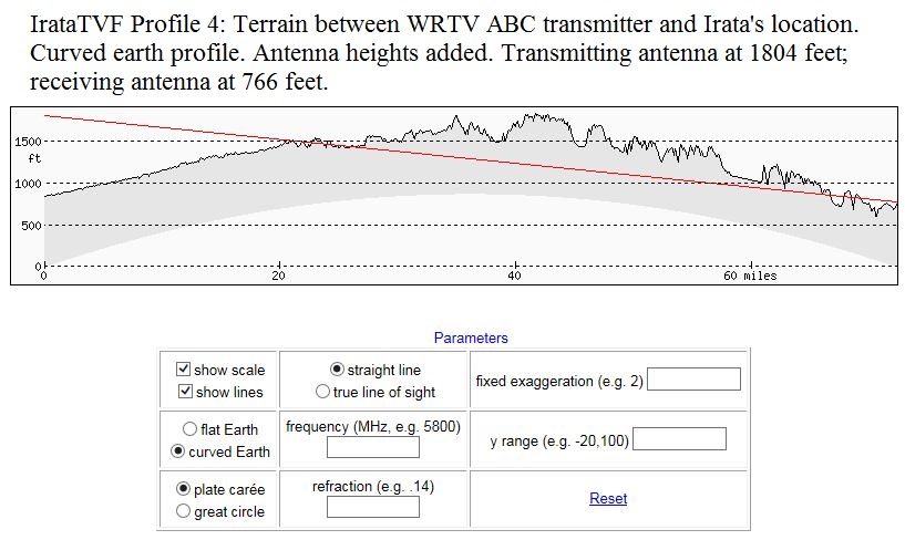 Here is a close-up of the tvfool profile at your location that shows the colors better: http://forum.tvfool.com/attachment.p...4&d=1440805432 Another way to demonstrate the Indianapolis problem is to use elevation profiles: http://forum.tvfool.com/attachment.p...5&d=1440805752 adding the antenna heights: http://forum.tvfool.com/attachment.p...6&d=1440805780 but the earth isn't flat: http://forum.tvfool.com/attachment.p...7&d=1440805803 |