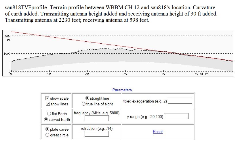 The HDB91x is also the wrong antenna for you. It would be OK for your UHF signals, real channels 14-51, but not so good for CBS on real channel 12. I don't have any experience with the HDHorizonX10 antenna, and I find the advertising copy hard to believe. It's just another small inefficient antenna with integrated high gain amp that tries to make up for its poor performance. Some people find that type of antenna works OK for them, but don't get your hopes up. Is this your test setup using one TV? Ant > RCA TVPRAMP1R > 50 ft RG6 > power inserter > TV If you have tried two antennas with that test setup for CBS with your antenna aimed at 41 degrees magnetic using a pocket compass, not a smart phone compass, and you still can't get CBS 100%, then there is something wrong with the equipment or it's the trees. You can see you are on the fringe of coverage: http://forum.tvfool.com/attachment.p...5&d=1442450853 And you can see that the signal just makes it over the terrain: http://forum.tvfool.com/attachment.p...4&d=1442450277 Usually, a VHF signal can get over terrain like that better than UHF, so without any photos of your location, I think the nearby trees are the problem. |