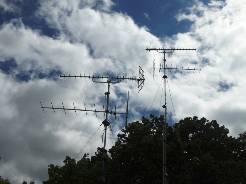 The RG 6 is about 75' to the combiner. Alternatively, an additional 6 feet to back of the TV when hooked directly to the TV. I also have a network that distributes it through the house which adds a lot of legs to the system, which is mainly why I used the preamp I chose. Plus, that preamp is a combiner, kills two birds with one stone. South Pointed Array: http://forum.tvfool.com/attachment.p...1&d=1470440489 My North pointing array is about 30' AGL and has an HDB91X above a 30-2476. They are also combined by an RCA PREAMP1. The RG-6 is about 45' to the indoor combiner, alternatively, an additional 6 feet to back of the TV when hooked directly to the TV. Sometimes I unhook the network and experiment with my TV in my man cave. ;) That TV has 2 RF inputs. North pointing array: http://forum.tvfool.com/attachment.p...1&d=1470441213 Both antennas are aimed correctly in the following pic. They both have rotators, which I found to be indispensable for aiming. For size & height comparison: http://forum.tvfool.com/attachment.p...1&d=1470441314 |