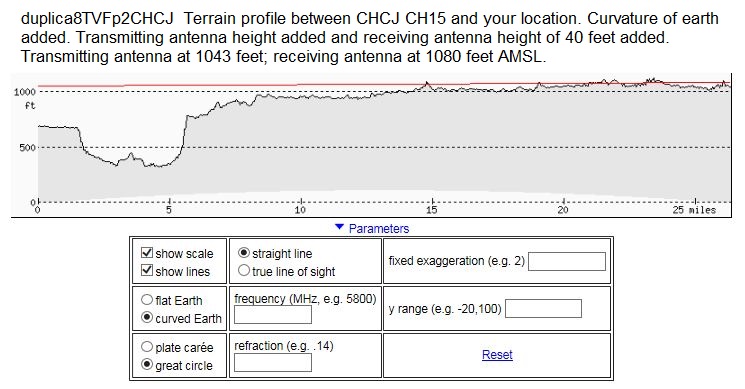 35.1 Intermittent CHCJ CTV Two real 35, virtual 35.1 https://en.wikipedia.org/wiki/CKVR-DT NM 12.7 dB, 2Edge, 26.4 mi, 124 deg t[rue http://forum.tvfool.com/attachment.p...1&d=1472840155 If your preamp gain is set for 30 dB, there is a good chance that the tuner is overloaded by CIII-DT with a signal power of -36.6 dBm, which will make the weaker channels more difficult to receive. -36.6 dBm + 12 dB ant gain + 30 dB preamp = +5.4 dBm http://forum.tvfool.com/attachment.p...1&d=1472844549 |