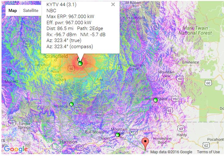 See I get the KYTV 3.1 3.2 3.3 all day long with mine but she don't. I see its in the grey area to. The KSPR-DT She can get them during the day its 33.1 33.2 33.3 but says 19 on the chart. I can get all these channels all day long. But at night I get a lot of extra ones to. Like the KOZL-TV I get 27.1 27.2 27.3 I also get all the K21JS 21.1 21.2 21.3 21.4 channels. All these work in the day also some but work the best at night. |