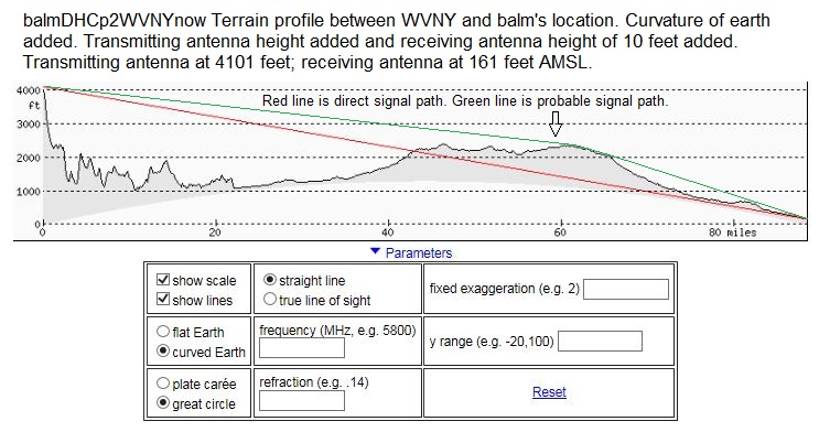 Keep in mind that the tvfool report is only a computer simulation, and is known to be less accurate for 2Edge and Tropo signals than for LOS signals. If you look at the terrain profiles for ABC and CBS from DC you will see that there aren't any direct signals from them because of terrain interference. The signals arrive at your location with the benefit of bending from atmospheric refraction and diffraction as they pass over the peaks. The transmitter is at the left; your location is at the right. WJLA http://www.tvfool.com/?option=com_wr...ALLTV%26n%3d13 WUSA http://www.tvfool.com/?option=com_wr...ALLTV%26n%3d13 In addition to the terrain interference, signals 82.9 miles away are blocked by the curvature of the earth. Reliable reception of signals that far away is not to be expected. Your 7777 preamp is probably being overloaded by your strong local signals, which makes reception of weak signals more difficult. CM cautions against its use in strong signal areas. http://www.channelmaster.com/TV_Ante..._p/cm-7777.htm |