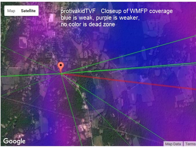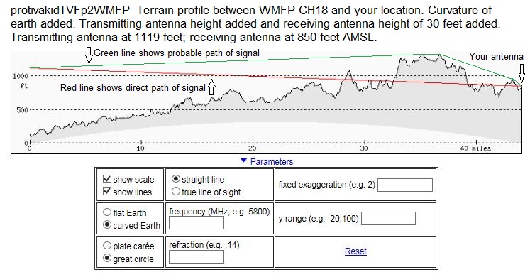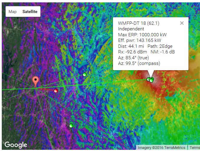 http://forum.tvfool.com/attachment.p...1&d=1481939375 You are on the extreme fringe of coverage for WMFP. Note that only 143 kW out of 1000 kW ERP is sent in your direction: http://forum.tvfool.com/attachment.p...1&d=1481939821 http://forum.tvfool.com/attachment.p...1&d=1481940831 You would need a high gain UHF antenna and a preamp for any chance at that. http://forum.tvfool.com/attachment.p...1&d=1481942705 It would probably help to tilt the front of the antenna up. The Antennas Direct 91XG and the Solid Signal HDB91X have the tilt feature. The DB8E has more gain for channel 18 with both panels aimed in the same direction, but it doesn't have a tilt adjustment; it would be a custom mod. I see that rabbitears.info has the proposed change: http://www.rabbitears.info/market.ph...&callsign=wmfp wiki also mentions it: https://en.wikipedia.org/wiki/WMFP I will study the other NBC alternatives when I have more time. |