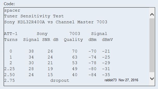 When the converter boxes came out, they had the best tuners because they had to meet performance specs to qualify for the coupon program. Later, the tuners in the TVs were improved to the same level. Lately, some of the tuners aren't as good for OTA because the manufacturers now think only in terms of cable use and streaming. Some "TVs" are even being sold without tuners and are called displays, what we used to call monitors. I have found that Sony TVs have good tuners for OTA and they also have a diagnostics screen that gives relative signal strength, SNR, and uncorrected errors; very helpful for antenna work. Here is the diagnostics screen for my KDL22L5000: Bad signal with picture freeze, SNR below 15 dB, and uncorrected errors: http://forum.tvfool.com/attachment.p...6&d=1438807158 Good Signal: http://forum.tvfool.com/attachment.p...7&d=1438807179 Lately, I have been doing experiments with indoor antennas, which are the only option for some people. This is the diagnostics screen for my KDL32R400A. I have added notes and a picture of the antenna. http://forum.tvfool.com/attachment.p...1&d=1486828373 In order to test for tuner sensitivity, I hook up two tuners with a splitter and a variable attenuator. I then increase the attenuation to see which tuner drops out last, making it the winner. The test can be made with or without a preamp, as long as the attenuator is after the power inserter if a preamp is being used. Ant > coax > variable attenuator > fixed attenuator > splitter > tuners The value of the fixed attenuator depends upon the strength of the signal. I use a fairly strong stable signal for testing. Sometimes a 20 dB fixed, sometimes a fixed 10 dB, and sometimes both. https://www.antennasdirect.com/store...ttenuator.html http://mjsales.net/collections/atten...ant=1083705673 Attenuation values 1, 3, 6, 8, 10, 12, 16, 20dB (FAM) click on 1 dB for other values; the up and down arrows are faint http://i496.photobucket.com/albums/r...psuvxmzfzq.png http://forum.tvfool.com/attachment.p...1&d=1490024524 The most recent tuner sensitivity test that I have done was to compare the CM7003 STB tuner with my Sony KDL32R400A that I had calibrated for signal strength with my signal level meter (SLM). But, you can make the test without knowing the absolute values for signal strength. The ATT-1 knob has 3-3/4 turns, so I put a mark on the knob with an ultra fine point Sharpie to count the turns. Clockwise rotation increases the signal; minimum attenuation at full clockwise rotation. I started there, and rotated the knob counterclockwise to increase the attenuation for the test. I used the WTKR CBS, RF 40, virtual 3.1 signal for the test. It wasn't as stable as an LOS signal that I usually use because of trees, but it was what was available for the test. These are the readings: http://forum.tvfool.com/attachment.p...1&d=1490037538 Dropout was at about -85 dBm, where you would expect it to be. Thermal Noise Floor -106 dBm + 15 dB SNR = -91 dBm and then adding tuner Noise Figure: -91 dBm + 6 dB Tuner NF = -85 dBm The CM7003 tuner is about as sensitive as the Sony, which is good, but the 7003 remote control isn't very responsive. The aim is critical and sometimes it is necessary to push a button more than once. I bought a Sony RM-VLZ620 Learning Remote and taught it some of the basic buttons on the CM-7003 remote. The box is much more responsive to the Sony remote. Original post for test: http://www.avsforum.com/forum/186-co...l#post48473881 |